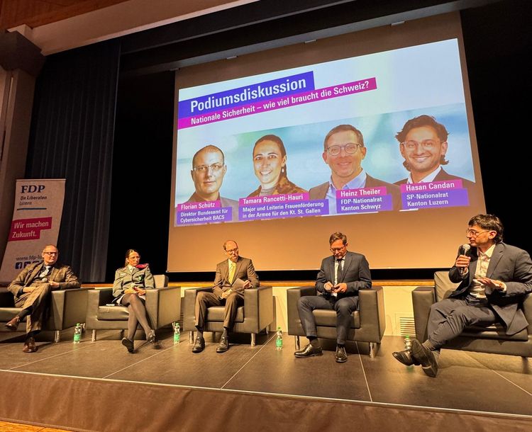 Im Anschluss an das Referat führte Moderator Raphael Prinz souverän durch eine prominent besetzte Podiumsdiskussion, welche die sicherheitspolitischen Fragen aus unterschiedlichen Blickwinkeln beleuchtete. Auf der Bühne nahmen Florian Schütz, Direktor Cybersicherheit des Bundes, Tamara Rancetti-Hauri, Major und Leiterin Frauenförderung der Schweizer Armee für den Kanton St. Gallen, Heinz Theiler, FDP-Nationalrat aus dem Kanton Schwyz, sowie Hasan Candan, SP-Nationalrat aus dem Kanton Luzern, Platz.
